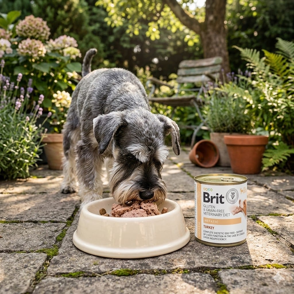 Karma hepatic dla psa Brit Veterinary Diet to pełnoporcjowa, mokra dieta weterynaryjna w puszce 400 g, która została opracowana z myślą o psach wymagających wsparcia żywieniowego przy chorobach wątroby.