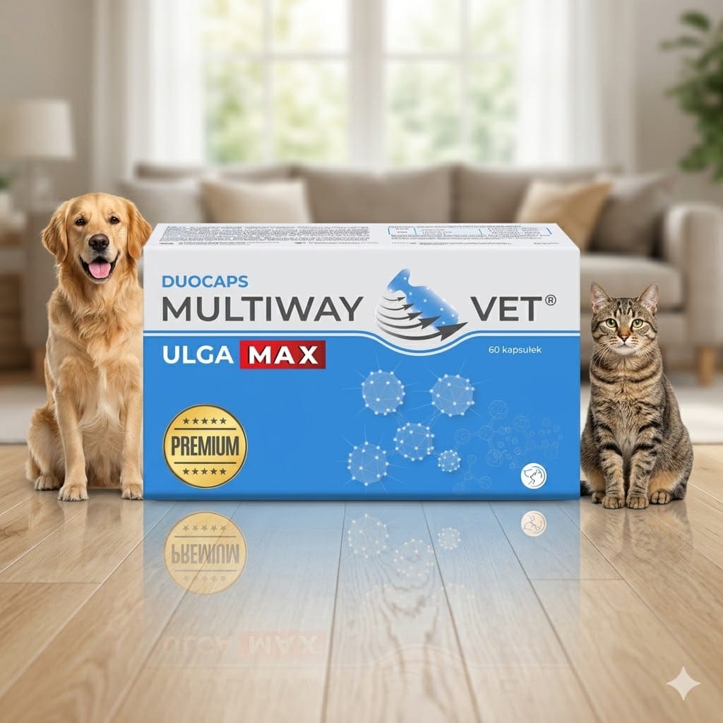 MULTIWAY VET® ULGA MAX to zaawansowany preparat w formie kapsułek twist-off, zaprojektowany, aby naturalnie łagodzić stres, niepokój oraz dyskomfort u psów i kotów.