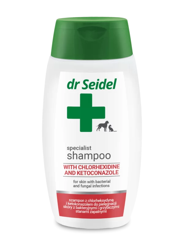 Zaawansowany szampon przeciwgrzybiczy i przeciwbakteryjny dla psa i kota Dr Seidel – szampon z chlorheksydyną i ketokonazolem dla psa i kota, stworzony do walki z najbardziej uporczywymi stanami zapalnymi skóry. Dzięki synergicznemu działaniu dwóch silnych substancji czynnych – chlorheksydyny i ketokonazolu – preparat skutecznie eliminuje bakterie Gram(+) i Gram(-) oraz drożdżaki i dermatofity. W rezultacie szampon błyskawicznie redukuje świąd i przywraca skórze zdrowie. Właśnie dlatego jest to niezastąpione wsparcie w terapii infekcji o podłożu mieszanym.